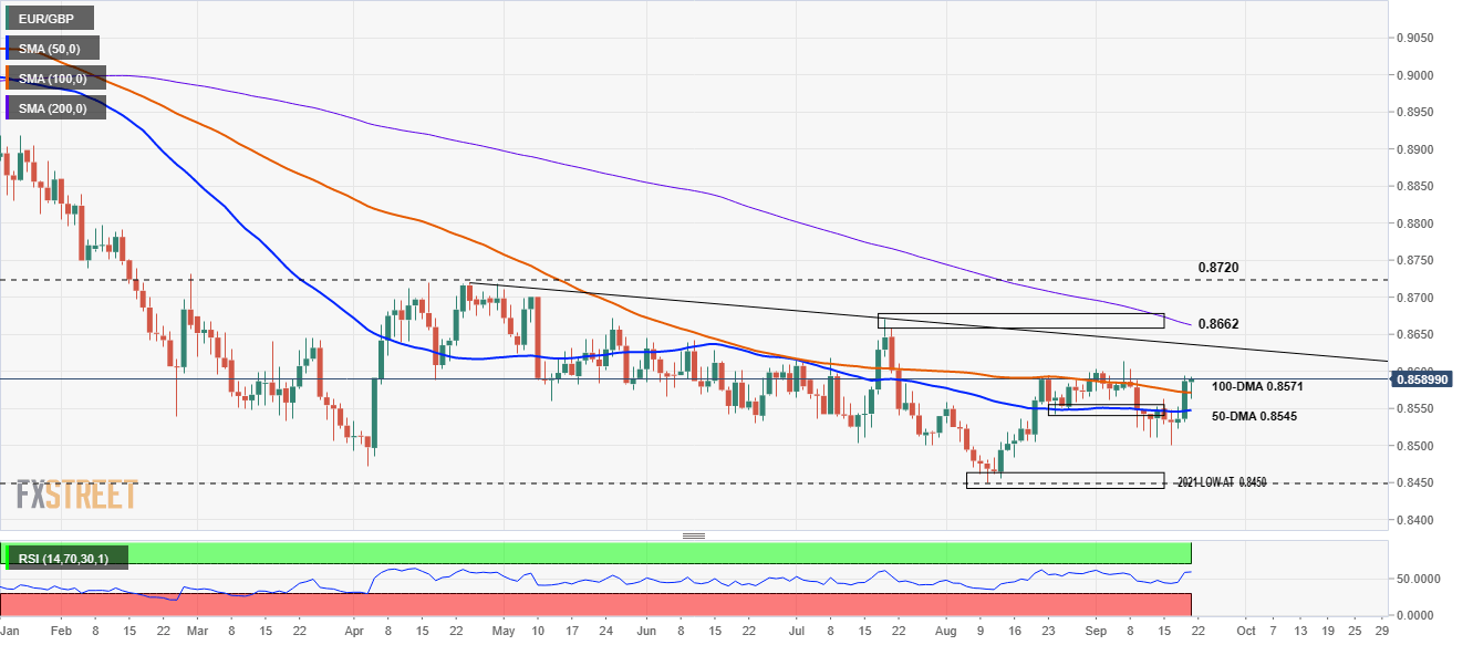 EUR/GBP Price Analysis: EUR/GBP broke above the 100-DMA, buyers target 0.8600