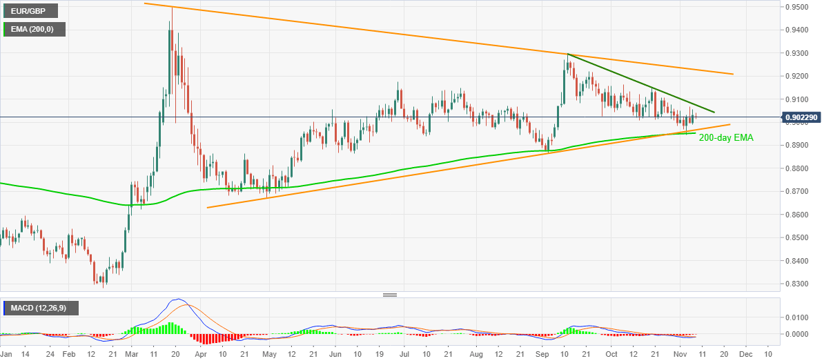 EUR/GBP picks up bids to 0.9022, down 0.10% on a day, during the pre-European trading on Monday. The pair dropped to the lowest in two months the last Wednesday before recovering from 200-day EMA.