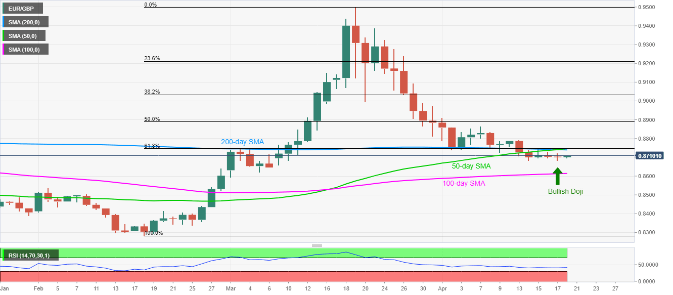 While justifying Friday’s bullish Doji, EUR/GBP rises 0.14% to 0.8711 ahead of the European open on Monday.