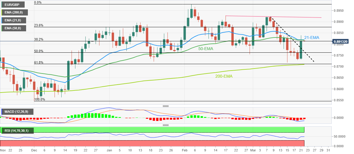 However, the recent easing in the bearish bias of the MACD signals and steady RSI joins the EUR/GBP pair’s successful break of a two-week-old descending trend line to keep the buyers hopeful of crossing the 0.8820 resistance confluence.