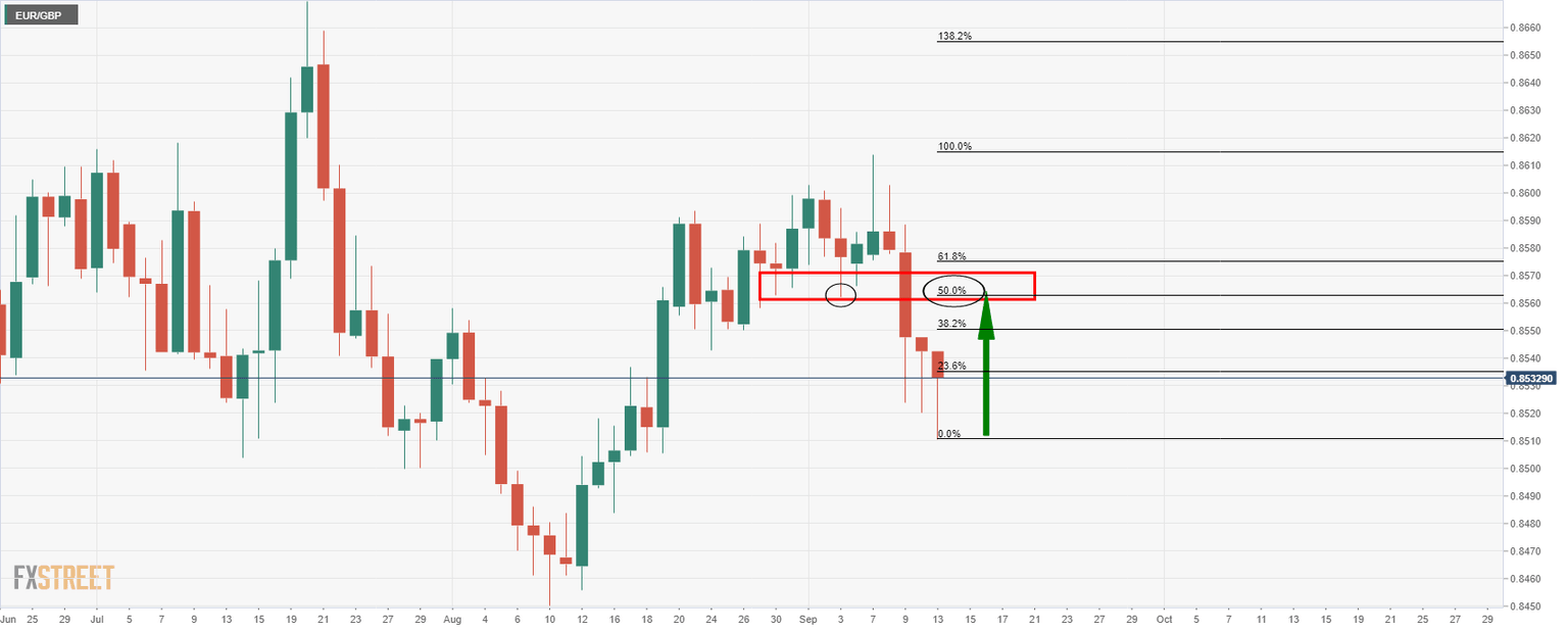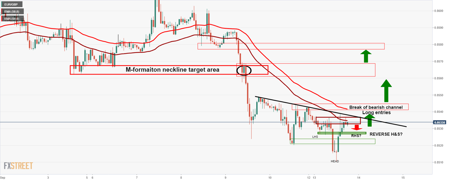- EUR/GBP bulls seeking a test of the M-formation's neckline.