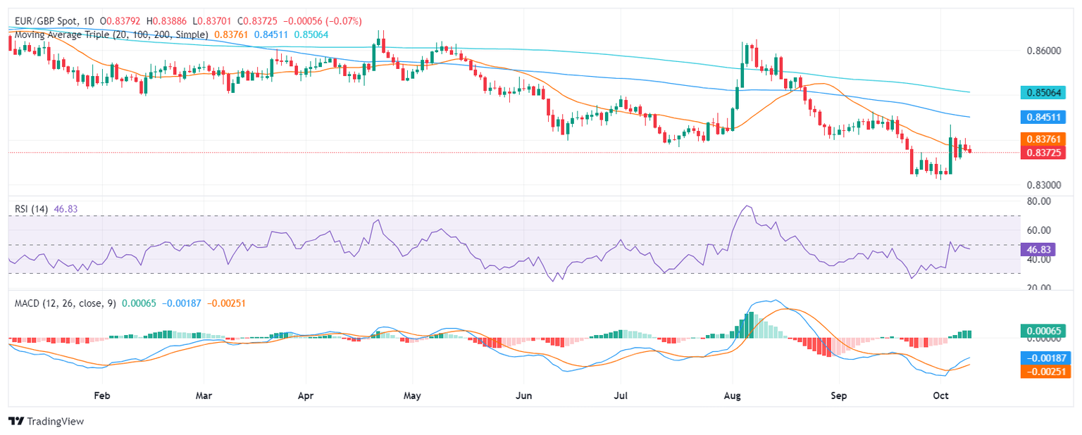 The EUR/GBP pair trades around 0.8380, consolidating sideways and displaying no clear trend. In addition, the cross lost the 20-day Simple Moving Average (SMA) which might a downwards leg.