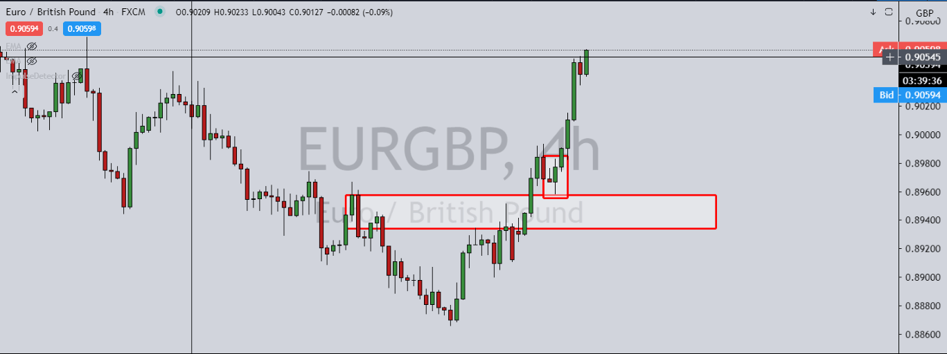 Having recently climbed out of a bearish channel, EUR/GBP is testing a resistance while in the bullish territory on the 4Hr charts.