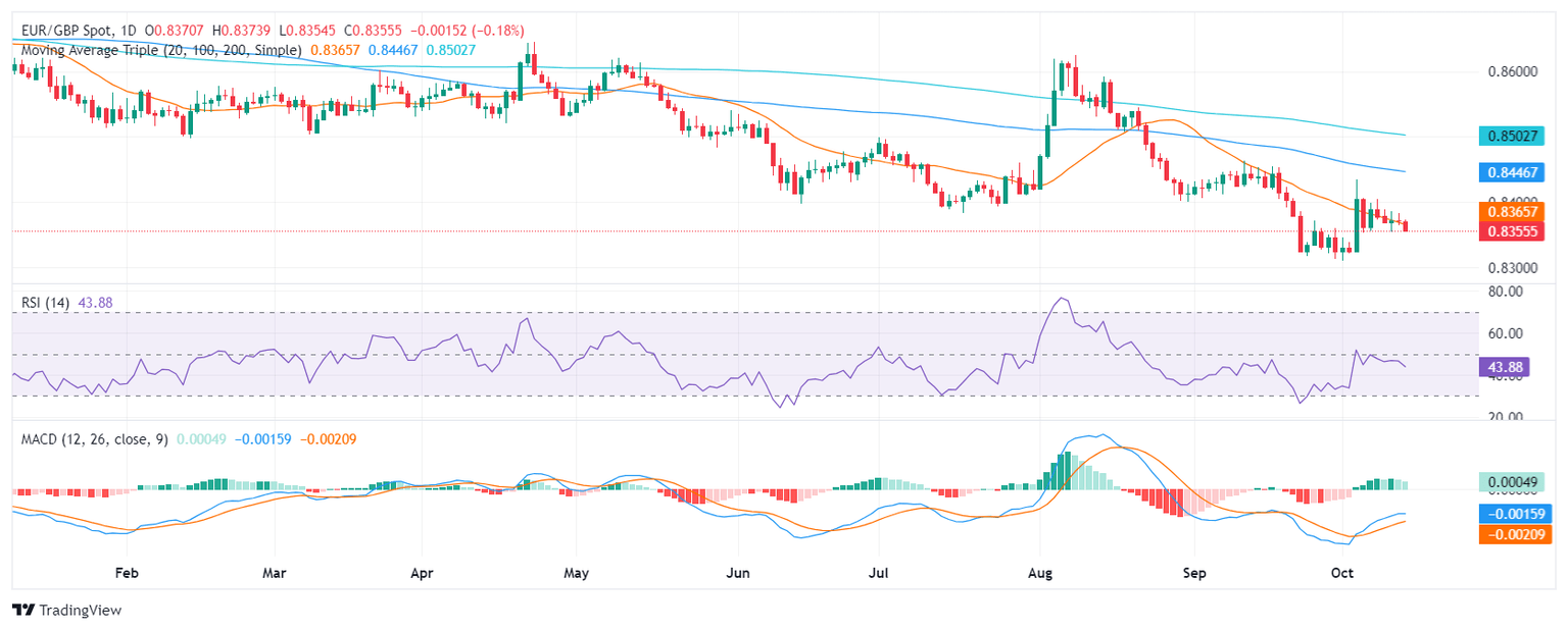 In Monday's session, the EUR/GBP declined and settled lower at around 0.8350, below the 20-day Simple Moving Average (SMA), a development that worsens the technical outlook and reinforce the short-term bearish bias
