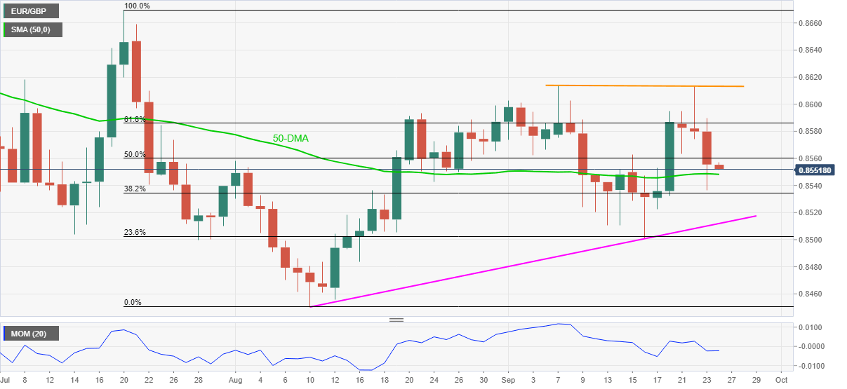 The cross-currency pair dropped the most in two weeks the previous day before bouncing off 0.8536. However, the corrective pullback couldn’t cross the immediate hurdle, namely the 50% Fibonacci retracement (Fibo.) level of July-August fall near 0.8560, to recall the sellers.