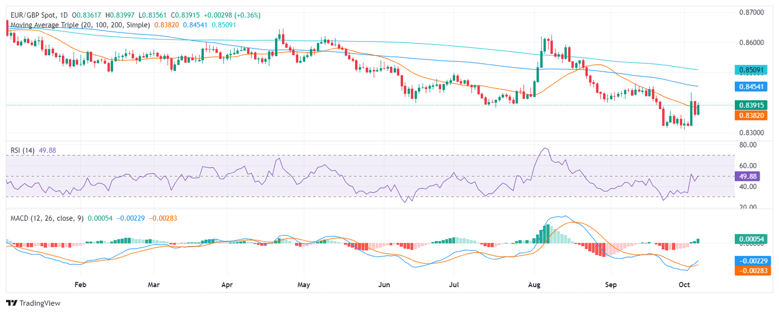 A break above the 0.8400 resistance level could trigger a bullish continuation and would open the door for further gains towards 0.8450 and 0.8500. A drop below the 0.8320 support level could lead to further declines. Above the 0.8380 line where the 20-day Simple Moving Average (SMA) converges, serves as a strong support which the bulls must hold to continue rising.