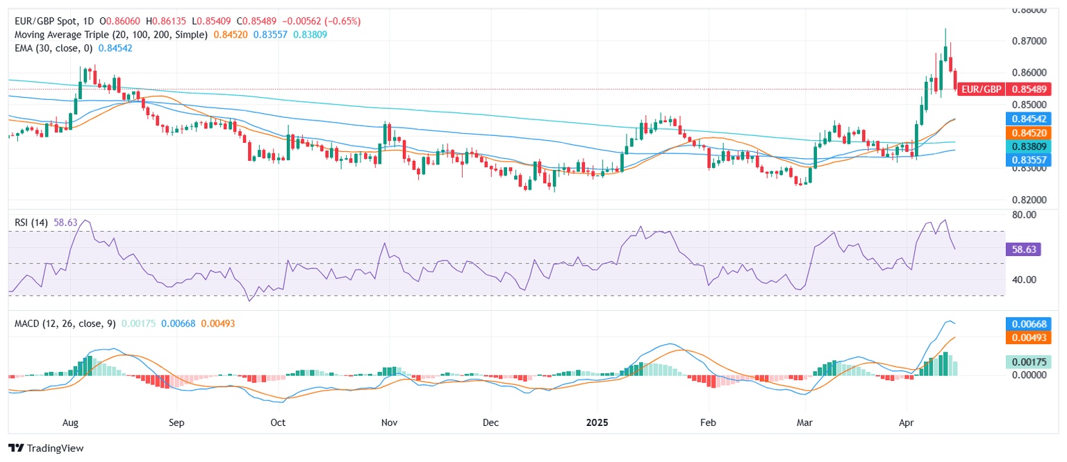EUR/GBP edged lower on Tuesday after the European session, retreating toward the bottom of its intraday range while holding just above key technical levels. The pair was last seen near the 0.8500 area, down modestly on the day, yet broader signals still point to underlying bullish strength.
