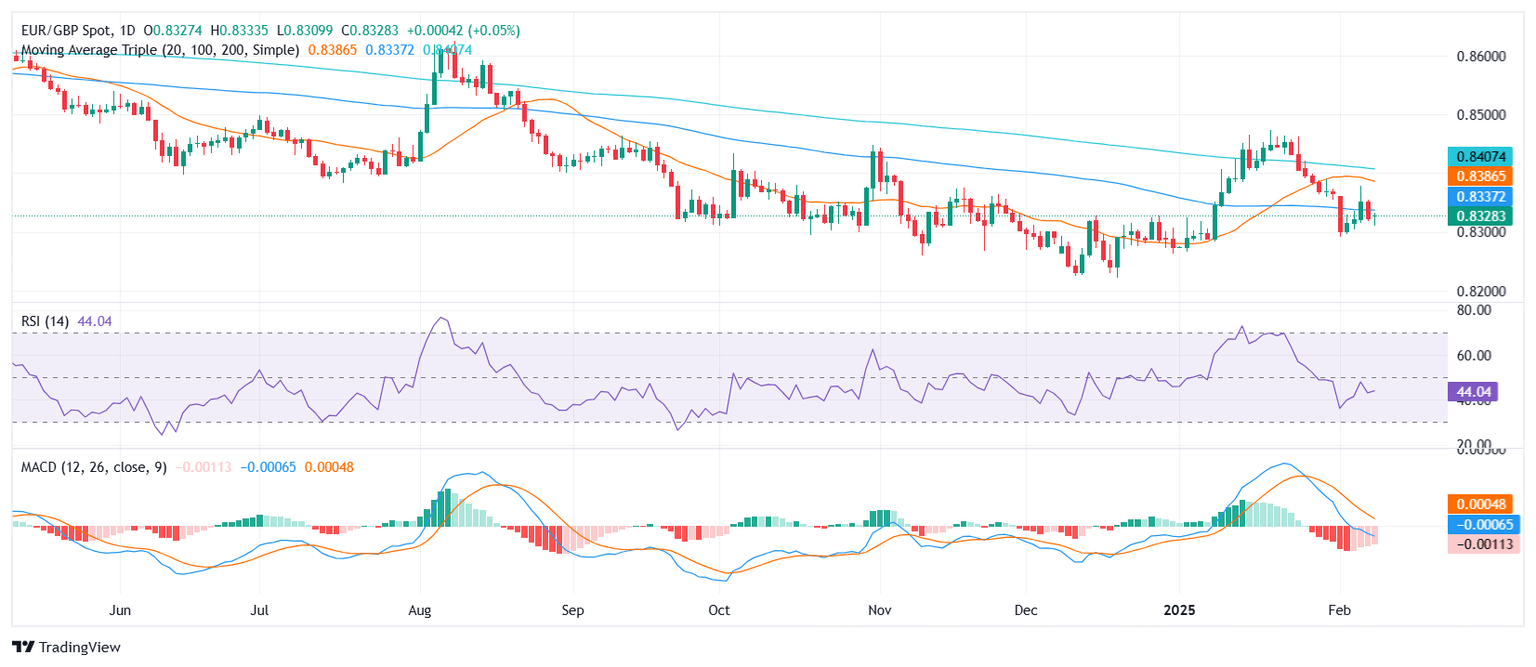 The EUR/GBP pair saw a mild uptick on Monday, rising to 0.8330, but remains under pressure as it struggles to reclaim the 100-day Simple Moving Average (SMA). Last week's inability to hold above this level further dampened sentiment, keeping the broader outlook tilted to the downside.