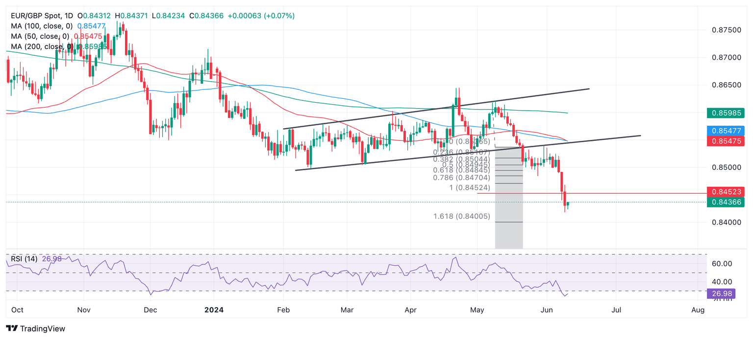 Given the dominant downtrend, the pair will probably resume its decline once any corrections complete. A break below 0.8418 (June 11 low) would create a lower low and probably result in a deeper sell-off, with 0.8400 coming in as the next target, followed by 0.8340 (August 2022 low).