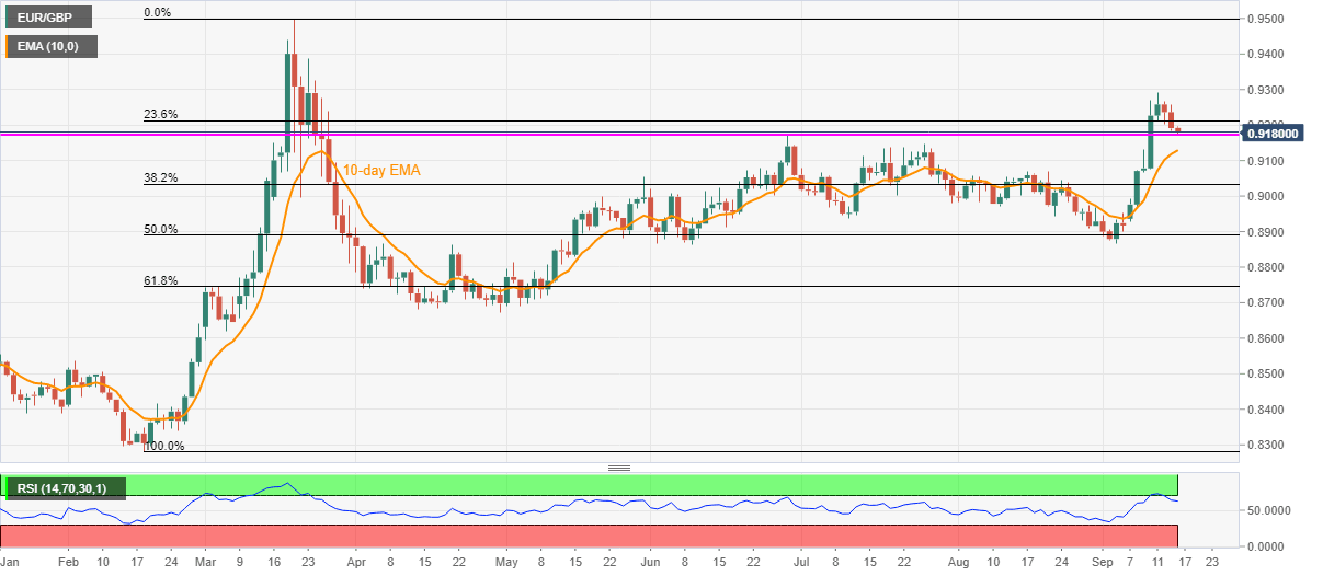EUR/GBP fades pullback from 0.9172 around 0.9180 amid the pre-European session open trading on Wednesday. In doing so, the quote portrays the cautious sentiment ahead of the UK’s Consumer Price Index (CPI) data for release for August, up for publishing at 06:00 GMT.