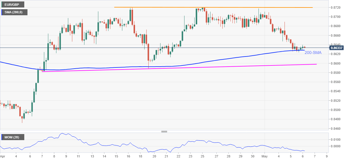 Despite staying near a two-week low, EUR/GBP bears are cautious as the quote prints 0.8635 figures on the chart while heading into Thursday’s European open. In doing so, the cross-currency pair prints a corrective pullback from the 200-SMA level amid a sluggish Momentum line.