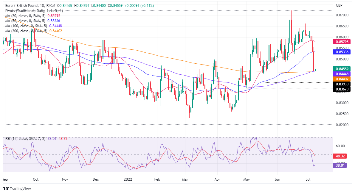 - EUR/GBP Price Analysis: Pressured around the 200-day EMA; once cleared, a fall towards 0.8300 is on the cards.