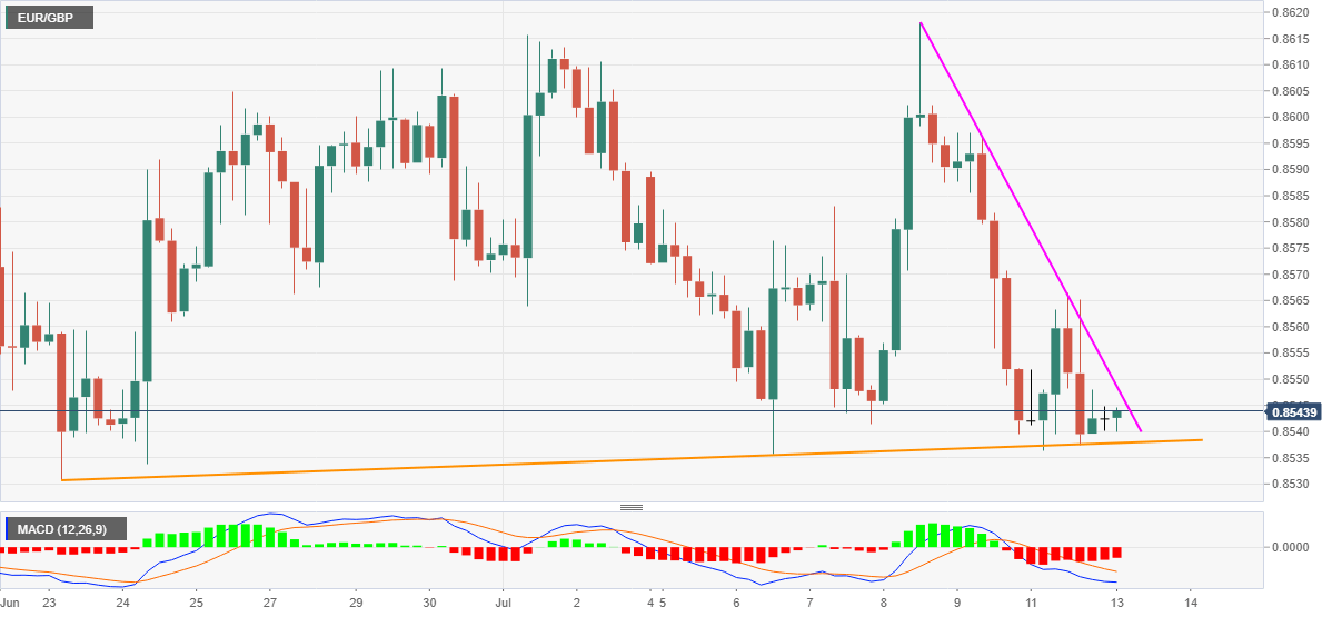EUR/GBP consolidates recent losses around 0.8545, up 0.05% intraday, amid early Tuesday. The cross-currency pair dropped to an ascending support line from June 23 the previous day before the bears took a breather.