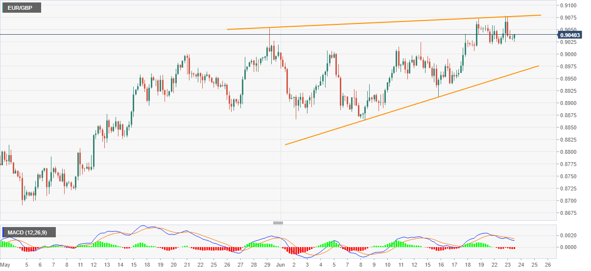 EUR/GBP prints 0.08% gains while trading around 0.9040 during the pre-European session on Wednesday. Even so, the pair portrays a bearish chart pattern on the four-hour set-up. The move gets further support from the latest pullback from 0.9080 as well as bearish MACD signals.
