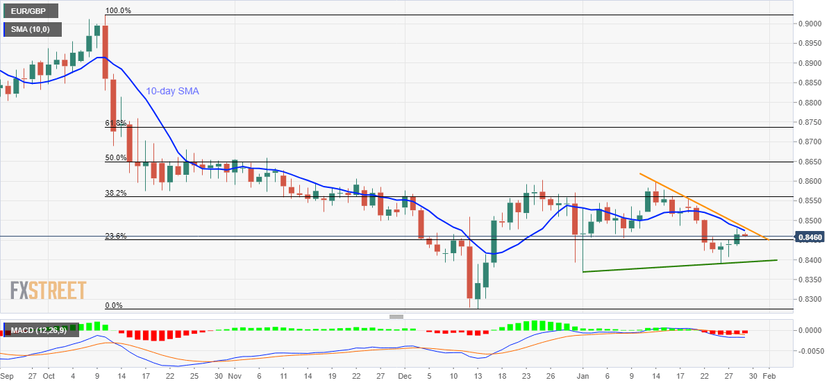 EUR/GBP declines to 0.8460 while heading into the European session on Wednesday. The pair recently took a U-turn from 10-day SMA, which in-turn drags it towards 23.6% Fibonacci retracement of its October-December 2019 declines.