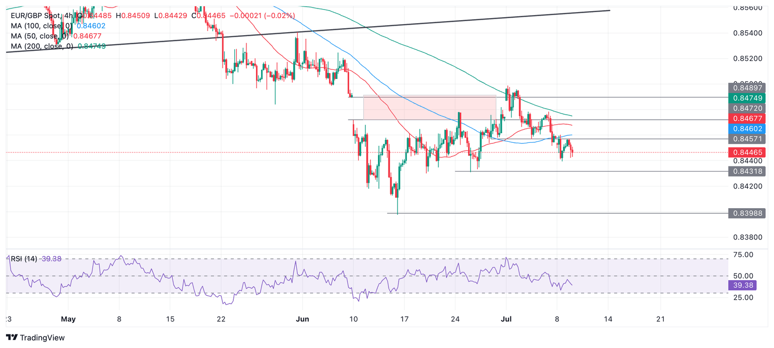 - EUR/GBP is falling towards its next downside target at the July 8 low.