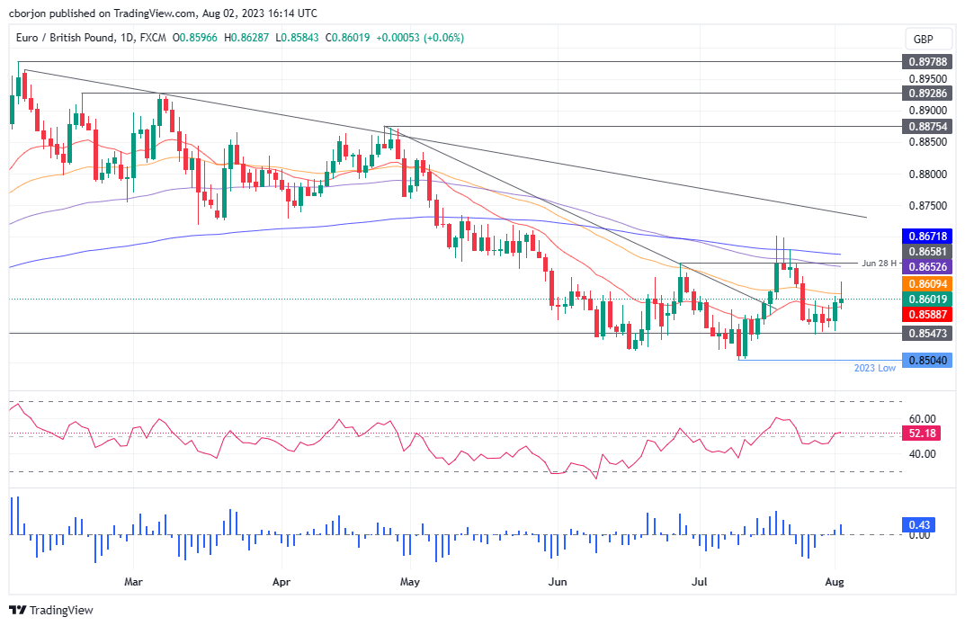 The EUR/GBP extends its gains to two consecutive days but faces solid resistance at around 0.8630, with the EUR/GBP pair dropping below the 50-day Exponential Moving Average (EMA) at 0.8609. At the time of writing, the EUR/GBP exchanges hands at 0.8607, gaining 0.12% after reaching a low of 0.8584.