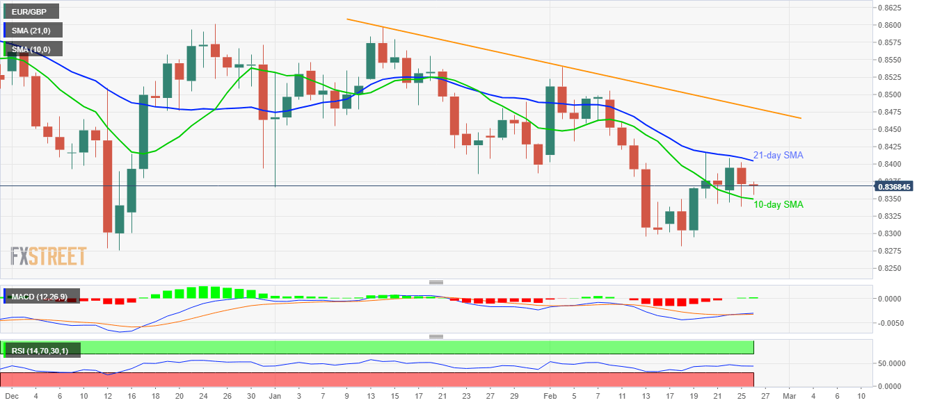 EUR/GBP trades around 0.8370, down 0.02%, while heading into the European session on Wednesday. That said, the pair stays inside a 55-pip range between 21-day and 10-day SMAs.