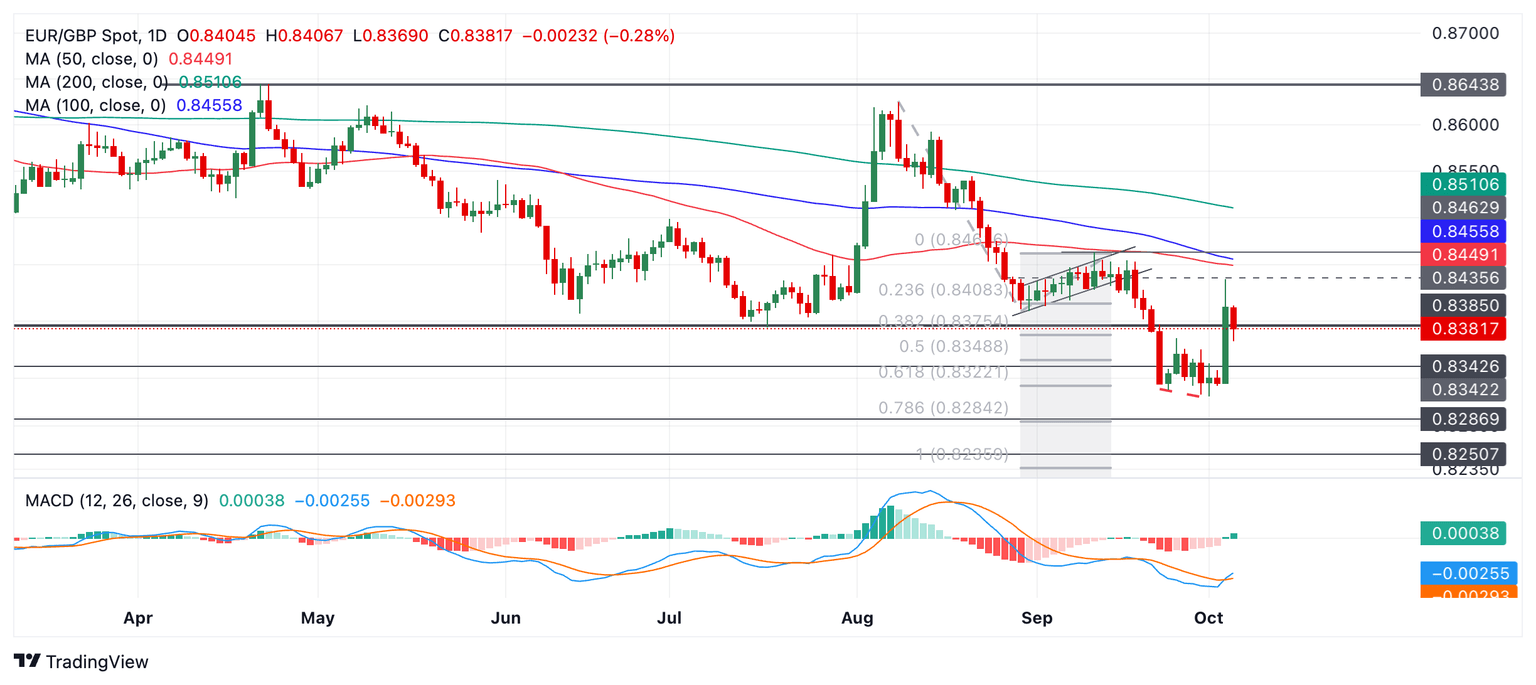 EUR/GBP pulls back down to the base of its multi-month range at 0.8380 after shooting higher on Thursday, October 3, as a result of comments made by the Governor of the Bank of England (BoE) Andrew Bailey.