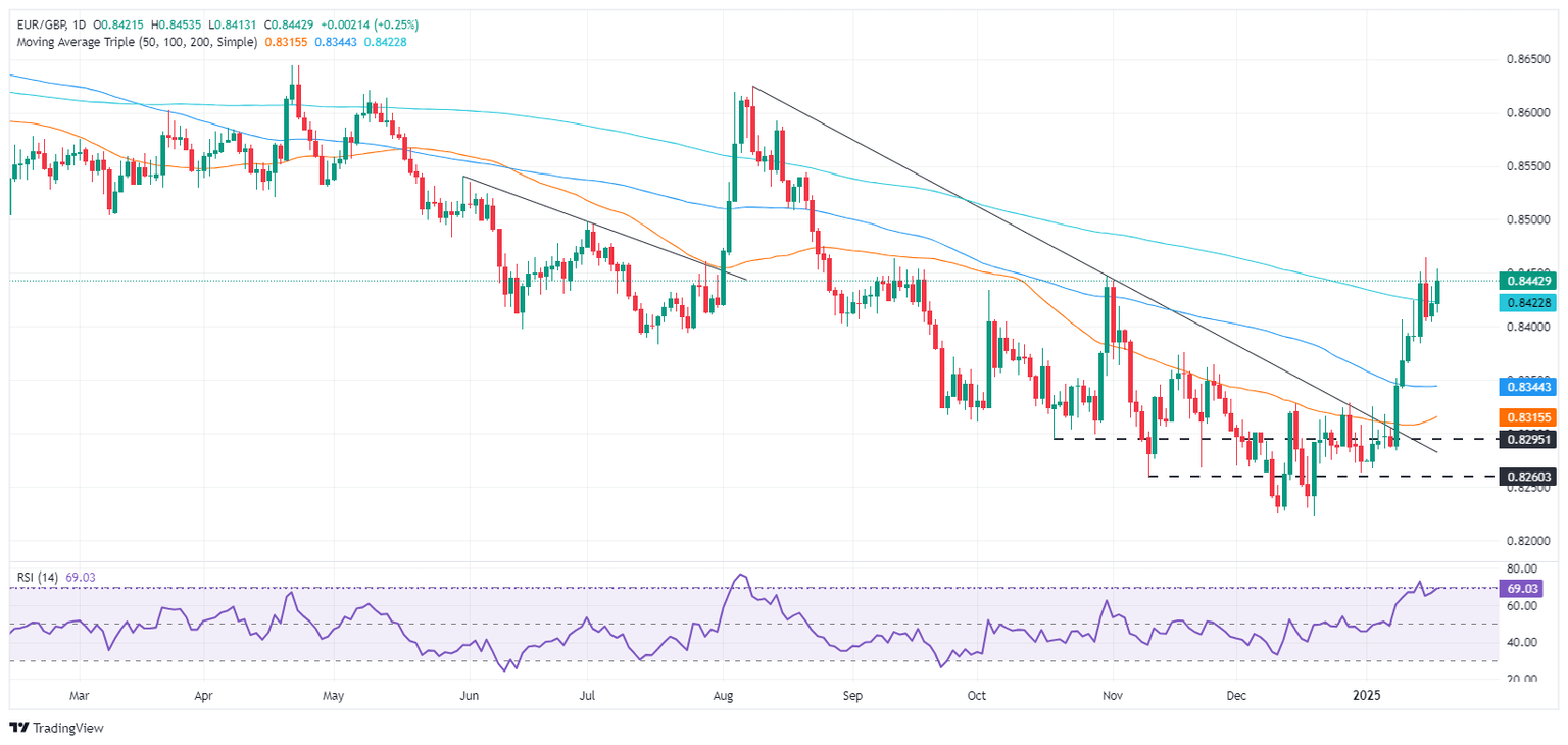 The Euro extended its gains versus the Pound Sterling on Friday, posting back-to-back bullish bars and climbing above the crucial 200-day Simple Moving Average (SMA) at 0.8425. This indicates bullish momentum is building as the EUR/GBP trades at 0.8443.