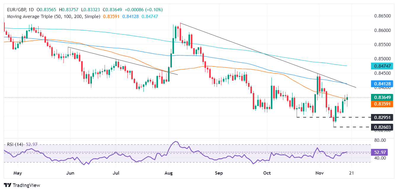 After hitting a year-to-date (YTD) low of 0.8260, the EUR/GBP has climbed past the 0.8300 figure, cleared on its way the 50-day Simple Moving Average (SMA) of 0.8359 and paving the way for a test of 0.8400. A breach of the latter will expose the 100-day SMA at 0.8413, followed by the October 31 swing high of 0.8448.