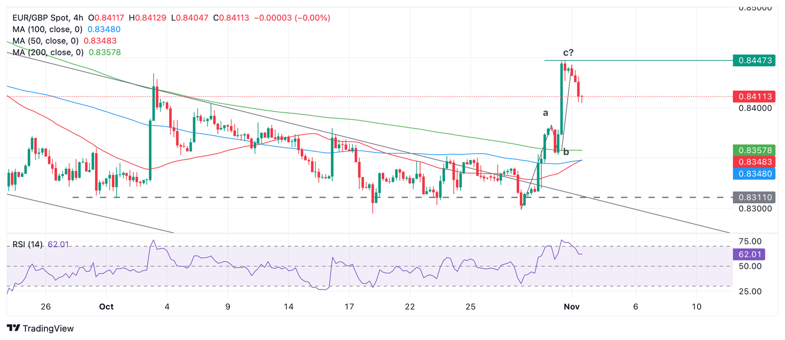 EUR/GBP pulls back after peaking in the 0.8440s. On Tuesday it bounced off key support (gray dashed line) at multi-year lows and surged over a penny higher. In the process it completed a three-wave, zig-zag-shaped pattern, with waves labeled a,b and c.