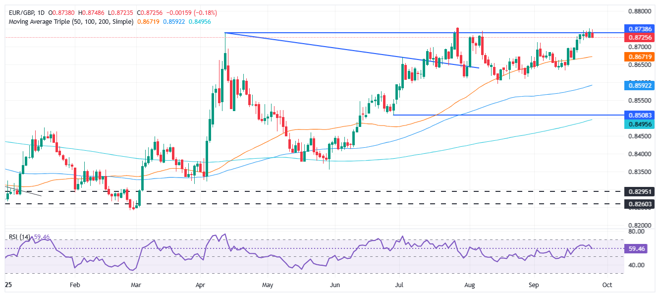 The Euro (EUR) reverses its course against the British Pound (GBP) amid a scarce economic docket in Europe and the UK on Friday, although geopolitics could be the reason that pushed the shared currency lower. EUR/GBP trades at 0.8729, down 0.14% at the time of writing.