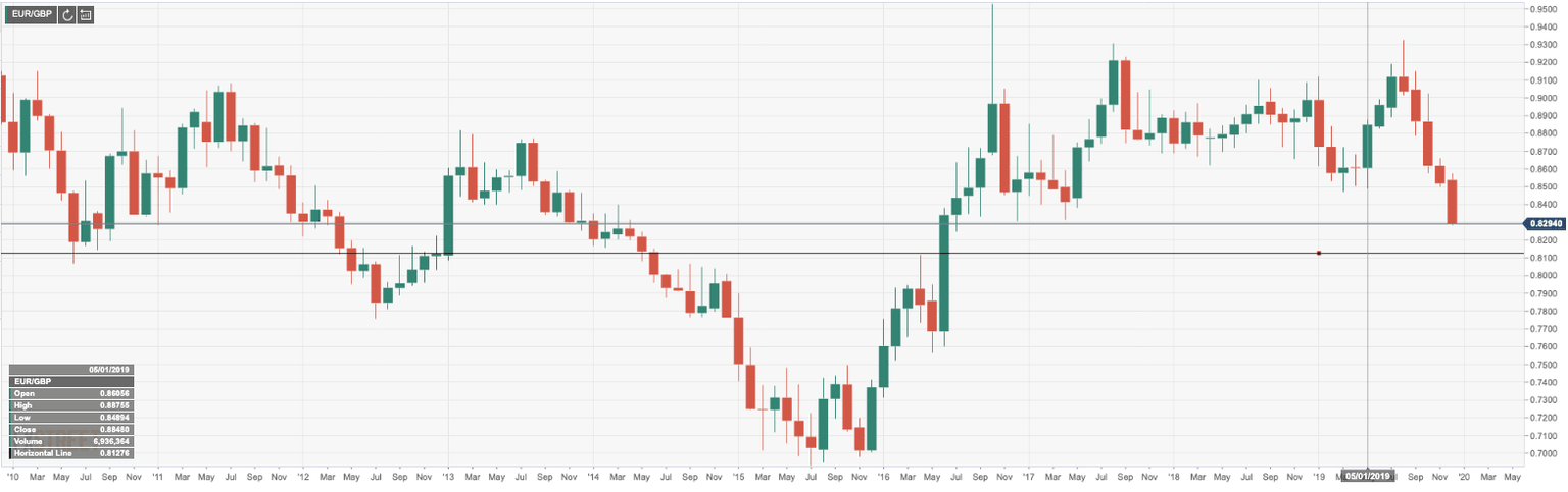 EUR/GBP has stabilised at a key support level near the lows of the day post the exit polls. EUR/GBP currently trades at 0.8283 having travelled down from a high of 0.8445 to a low of 0.8278. The UK election exit polls give the Tory party a majority of 86 in what will be a “phenomenal victory” is the exit polls are accurate.