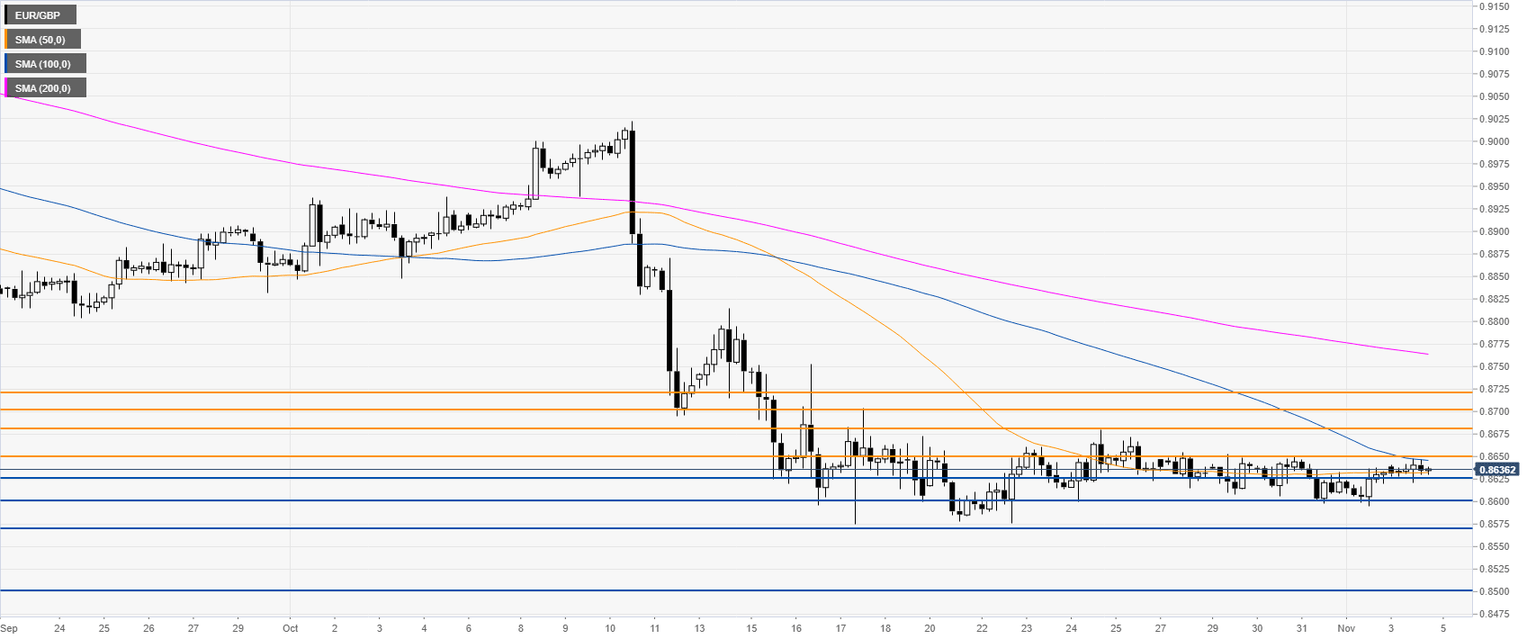 On the daily chart, EUR/GBP is trading in a bear trend below its main daily simple moving averages (DMAs). Over the last weeks of trading, the euphoria of a Brexit deal sank the spot below near the 0.8600 handle. This Monday, investors will be on the lookout for any comments on monetary policy from the newly appointed ECB’s President, Christine Lagarde, at 20:30 GMT.