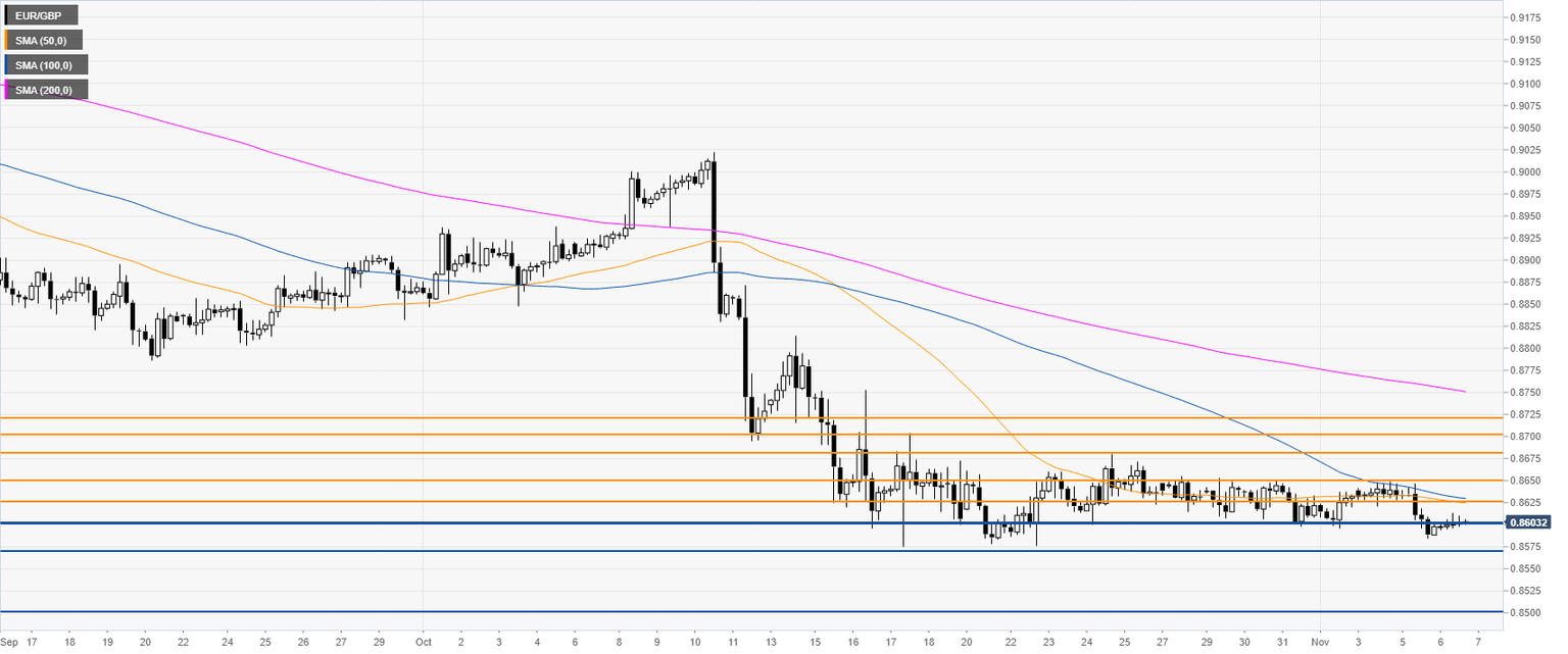 On the daily chart, EUR/GBP is trading in a downtrend below its main daily simple moving averages (DMAs). In the last weeks of trading, the optimism of a Brexit deal drove the spot to the 0.8600 figure.