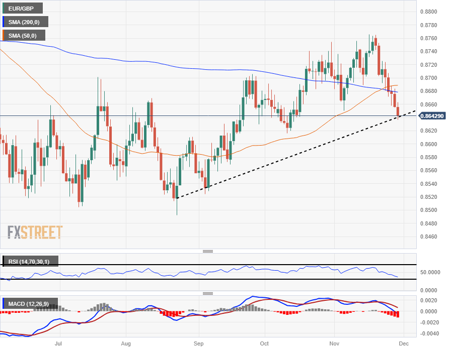 The EUR/GBP is dropping away from the 200-day Simple Moving Average (SMA) after making a clean break of the moving average from 0.8680, and the pair is dipping into fresh lows for November heading into the end of the month.