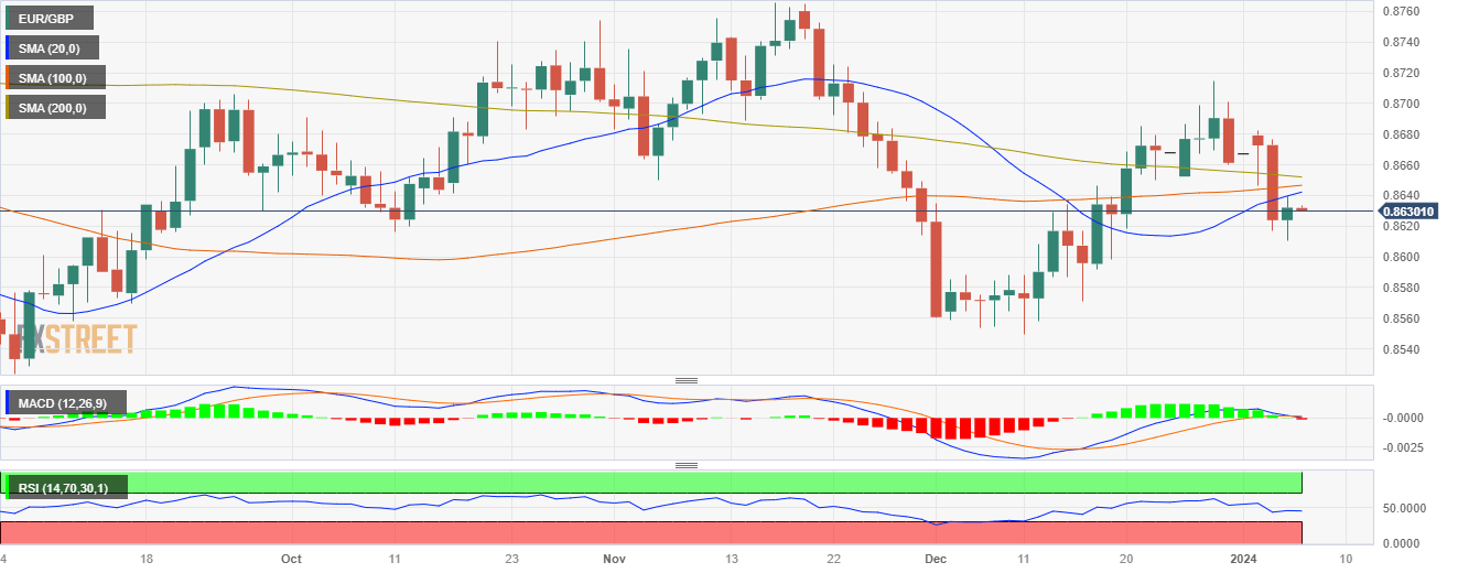 In Thursday's session, the EUR/GBP was recorded at 0.8630, gaining 0.20% with a peak at 0.8640. The pair demonstrated neutrality, leaning towards bearish on the daily chart, with bears taking short respites after Wednesday's downswing of 0.50%. Meanwhile, the four-hour chart outlook remains negative despite the brief recovery.