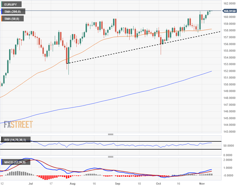The EUR/JPY clipped the 161.00 handle on Tuesday, etching in a 15-year high as the pair clatters along the ceiling heading into a round of EU Retail Sales figures.