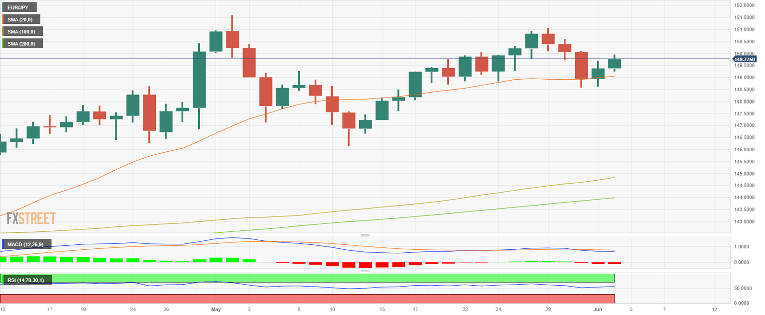 The EUR/JPY closes the week trading with gains above 149.80 as the Yen weakened across the board on Friday, against its major rivals, including the Sterling Pound, Swiss, the US and Australian Dollars. On the other hand, the Euro is getting traction on the back of rising German bond yields following ECB Lagarde's hawkish comments in Thursday's session.