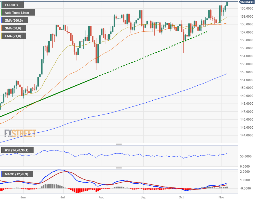 The EUR/JPY is clipping into new 15-year highs near 161.00, coming within inches of the price handle in Monday trading. The pair hit high bids of 160.98, and further upside could be on the cards for the Euro (EUR) as the Japanese Yen (JPY) flounders under the weight of a dovish Bank of Japan (BoJ).