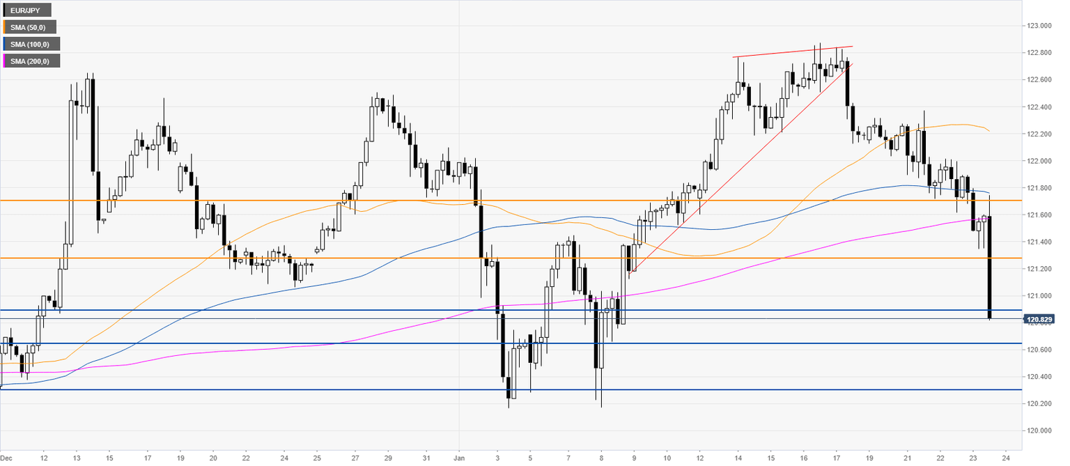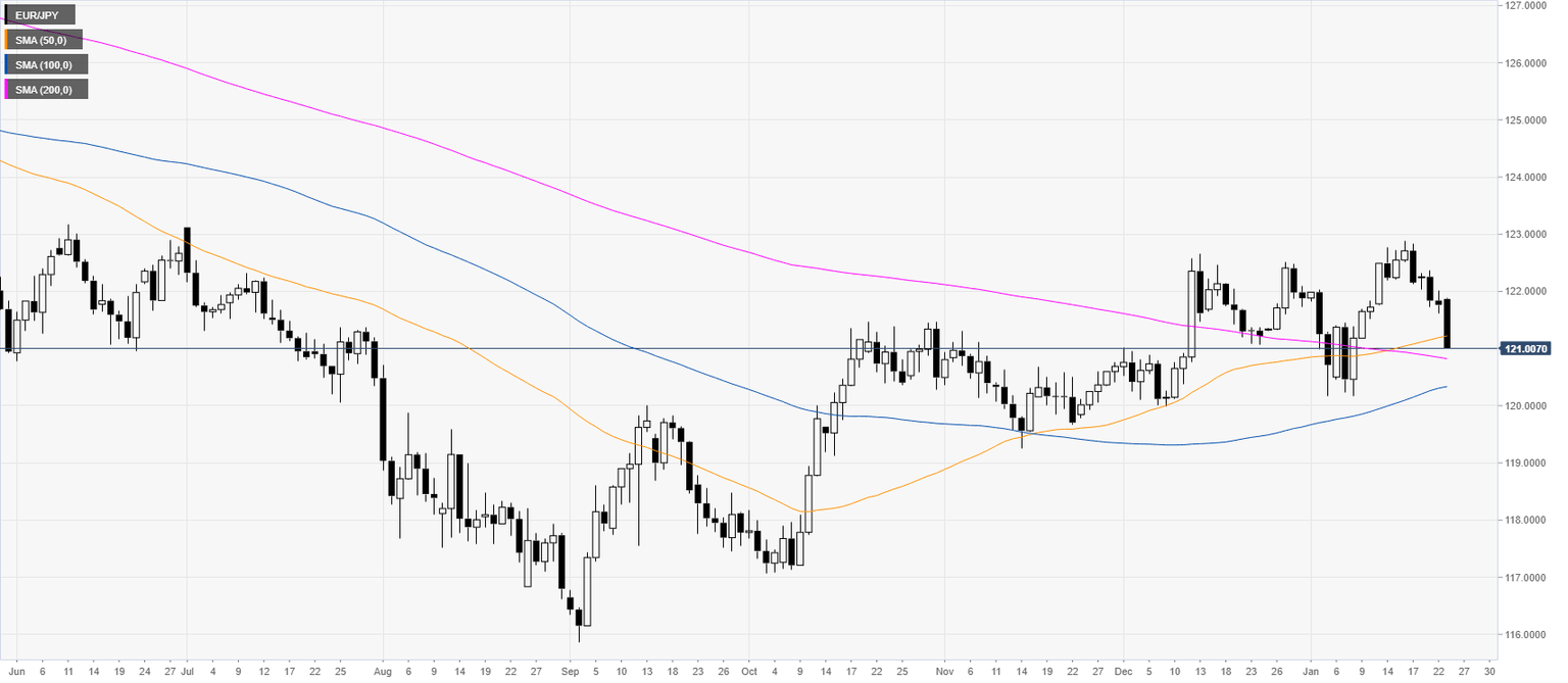 - EUR/JPY is under heavy selling pressure below the 121.27 resistance.