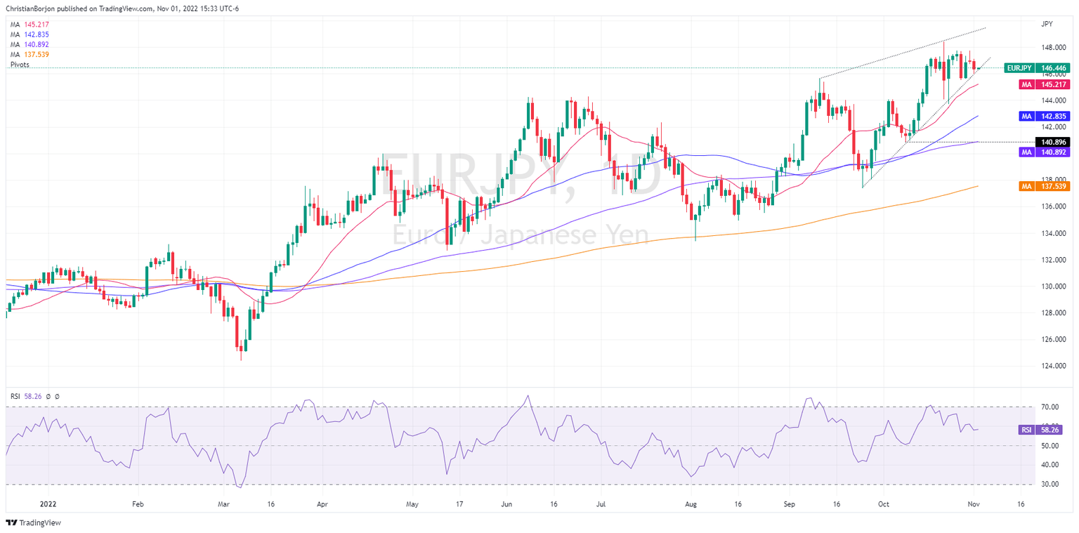 While the EUR/JPY retreated from weekly highs around 147.75, as shown by the daily chart, the uptrend remains intact – for now. However, the emergence of a rising wedge, lays the ground for a pullback, at least to the 20-day Exponential Moving Average (EMA) at 145.21, ahead of critical support reached on October 24, following the Bank of Japan (BoJ) FX intervention at 143.72, shy of the 144.00 figure.