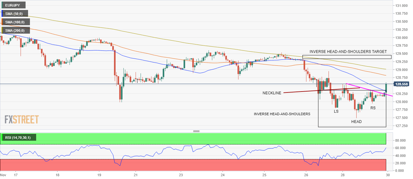 The EUR/JPY 1-hour chart displays the formation of an inverse head-and-shoulders a reversal pattern with bullish implications. Furthermore, at press time, the EUR/JPY jumped off the confluence of the 50-hour simple moving average (HSMA) and the neckline, from 128.20s levels towards the November 29 high at 128.67.