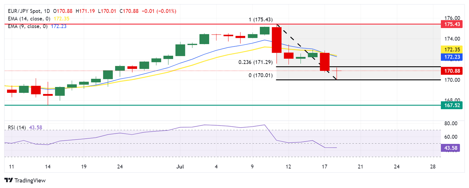 EUR/JPY edges higher to near 170.90 during the Asian session on Thursday. The daily chart analysis shows that the pair lies below its 9-day Exponential Moving Average (EMA), suggesting downward momentum in the short term. This signals that it may be prudent to hold off on buying until the trend shows signs of reversal.
