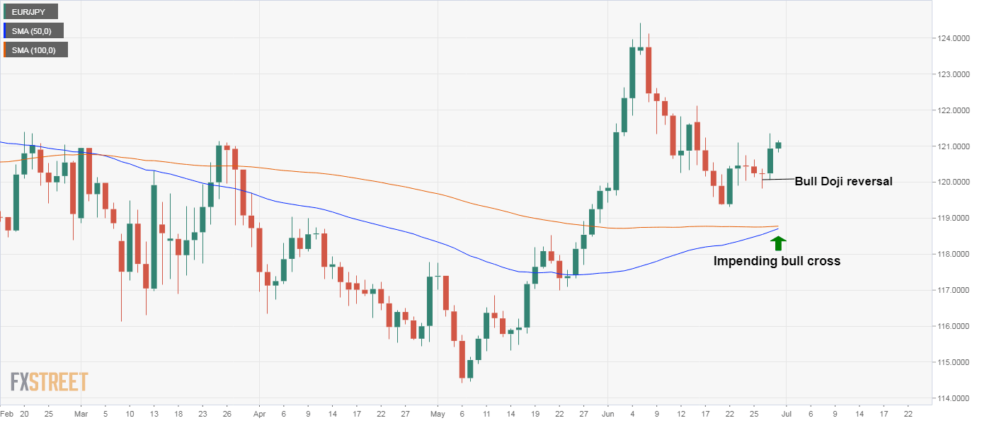 EUR/JPY Price Analysis: Bid above 121.00 as key MAs eye bull cross