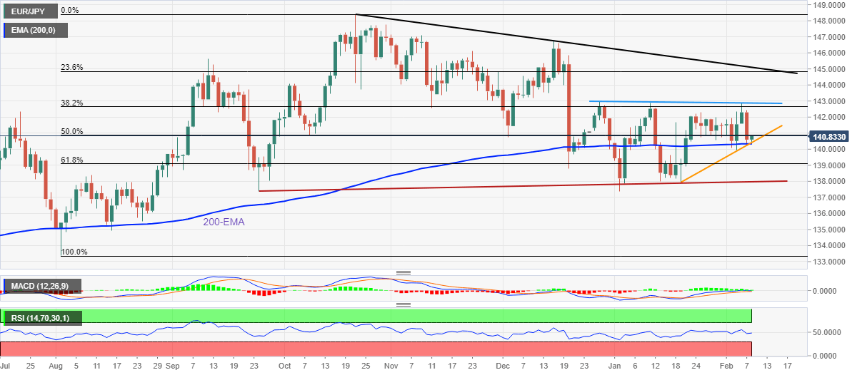 EUR/JPY picks up bids to 140.80 while paring the biggest daily loss in nearly a month during Wednesday’s sluggish Asian session. In doing so, the cross-currency pair bounces off a convergence of the 200-day Exponential Moving Average (EMA) and an upward-sloping support line from January 19, 2023, close to 140.40-30 at the latest.
