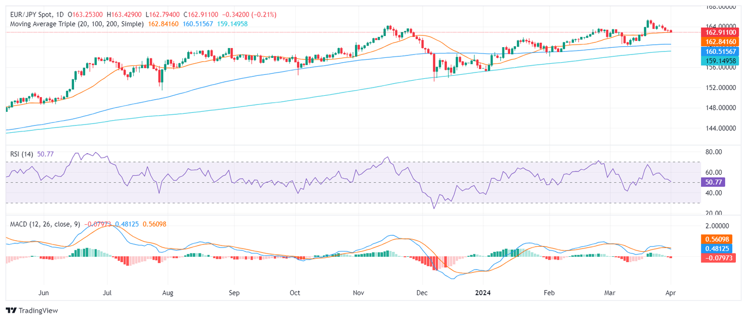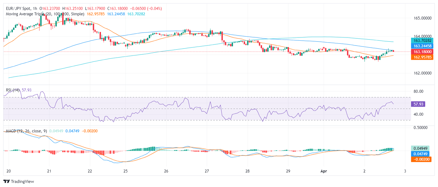 The EUR/JPY pair is currently oscillating around the 163.20 mark, showing a slight increase in Tuesday’s session. The persisting momentum suggests an upper hand for the bulls, but if the pair falls below the 20-day Simple Moving Average (SMA), there may be a likelihood for sellers to force a momentum shift.