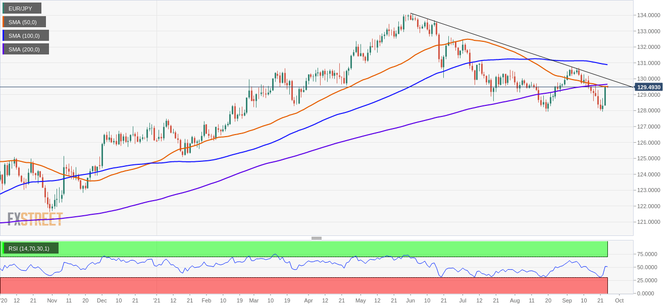 The EUR/JPY uptrend move was capped by the confluence of the 50 and the 200-day moving average (DMA) around 129.51. A daily close above the latter would support the bullish bias in the EUR/JPY. In case of that outcome, the EUR/JPY bulls will find their first resistance level at the downslope trendline around the 130.00-20 range. The following supply zones would be the September 8 swing high at 130.69, followed by the psychological 131.00.