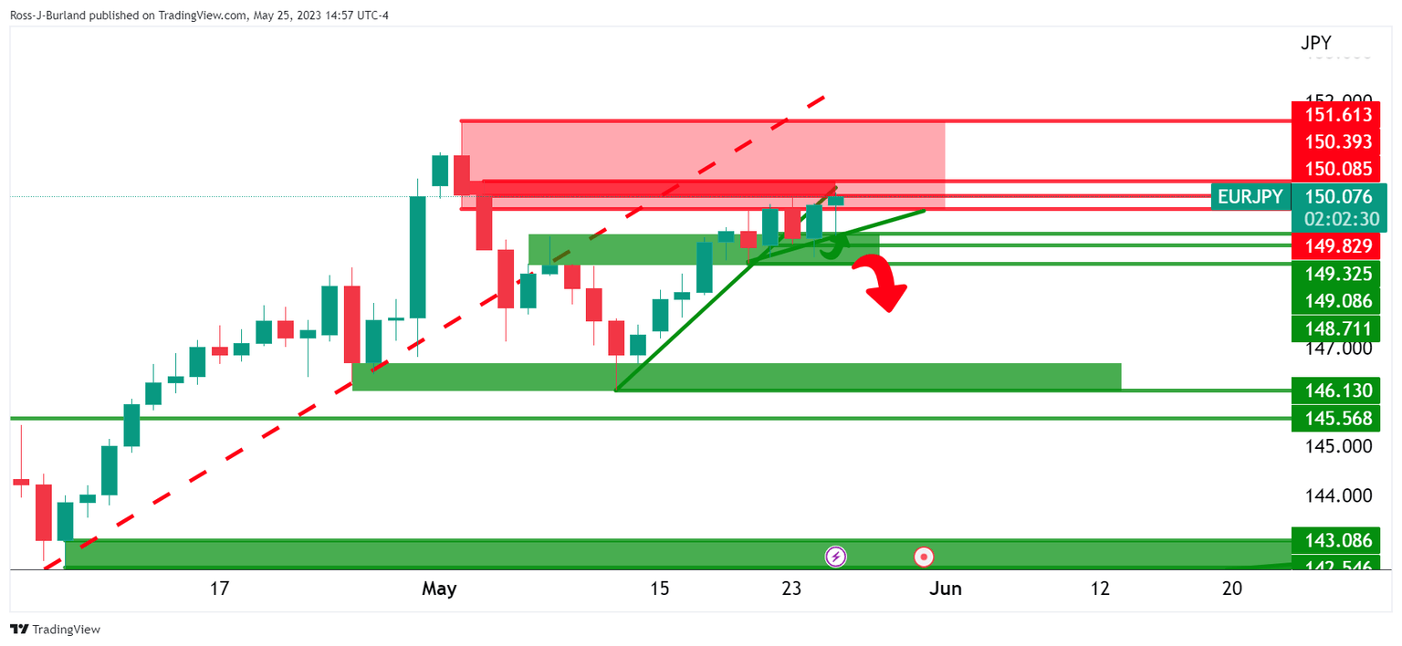 EUR/JPY is currently trading at 150.10 and has traveled between a low of 149.37 and a high of 150.15 so far on the day. The following illustrates the market that is attempting to break into the resistance area although shows prospects of a meanwhile correction into trendline support.