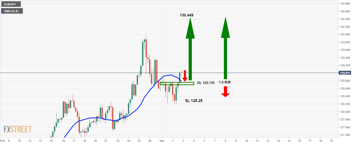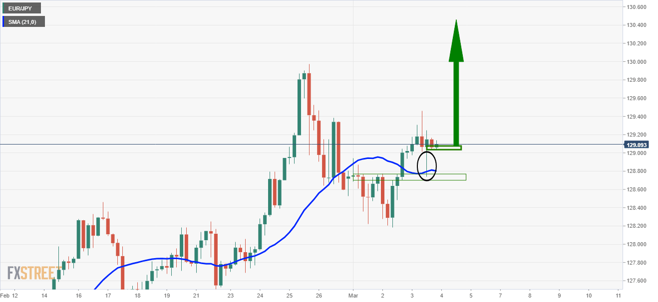 As per the prior daily and 4-hour chart analysis, EUR/JPY Price Analysis: Bulls setting up for higher daily highs to 130.45, EUR/JPY's upside remains in play.
