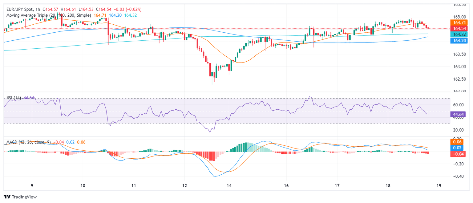 Meanwhile, on the hourly chart, the EUR/JPY's RSI declined below its middle zone, with the latest reading of 44 as of the last hour. This could point towards a pending period of consolidation. The Moving Average Convergence Divergence (MACD) displays rising red bars, also hinting at a temporary slowdown in the bullish momentum.