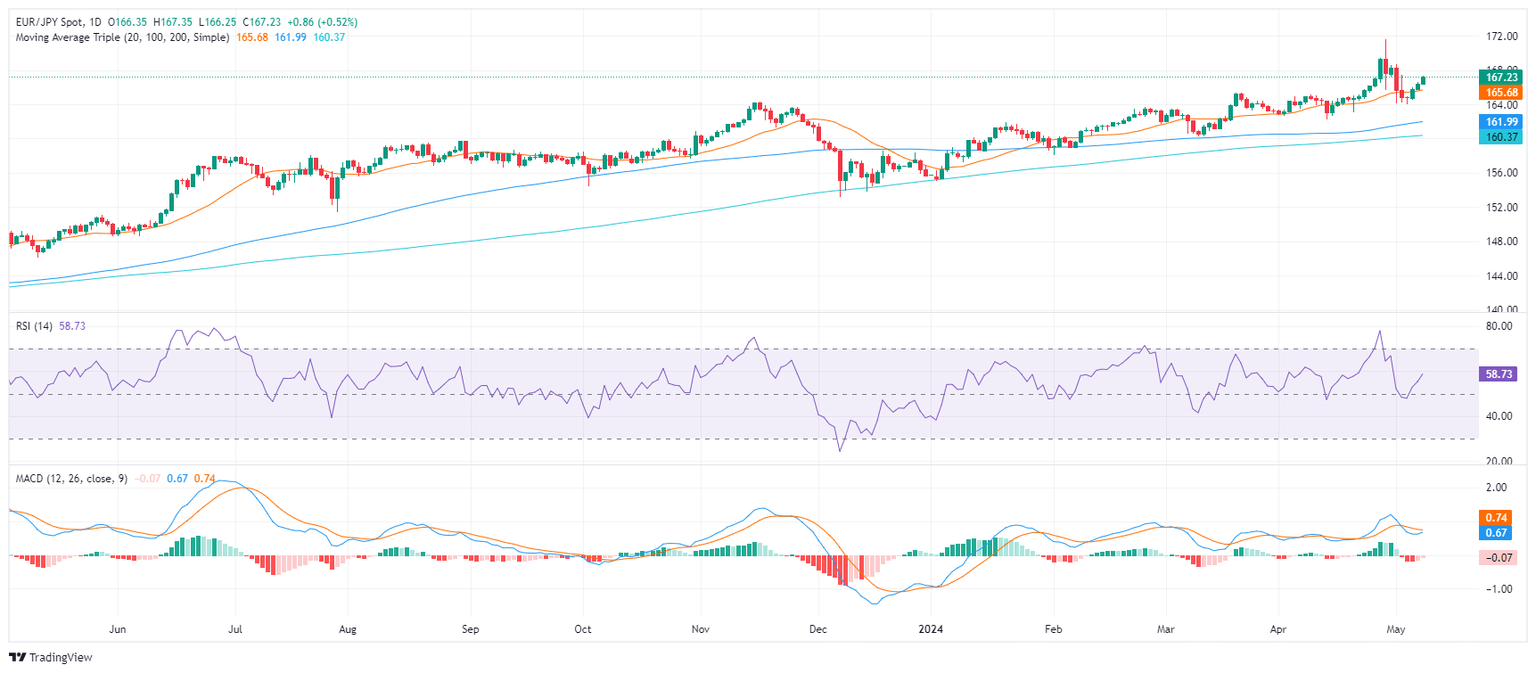 The EUR/JPY pair continues to exhibit strong momentum, displaying gains of 0.55% on Wednesday. With buyers maintaining dominance, the pair remains steadfast above its key Simple Moving Averages (SMAs) in both the short and long term, indicating the potential for a further upward move. The latest downward movements may have been only corrective as bears lacked the conviction to hold the pair below the 20-day SMA and buyers recovered ground.