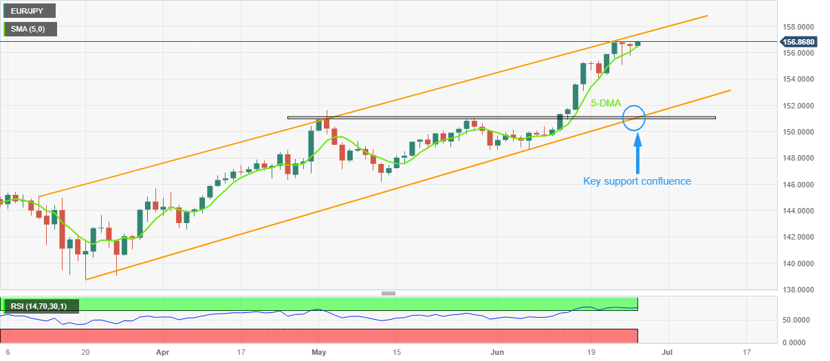 Hence, the bullish trend channel and hawkish comments from ECB policymaker Matin Kazaks join the broad Euro run-up to favor the pair buyers. However, the overbought RSI (14) line challenges the quote’s further upside as it prods the stated channel’s top line, close to 157.50 by the press time.