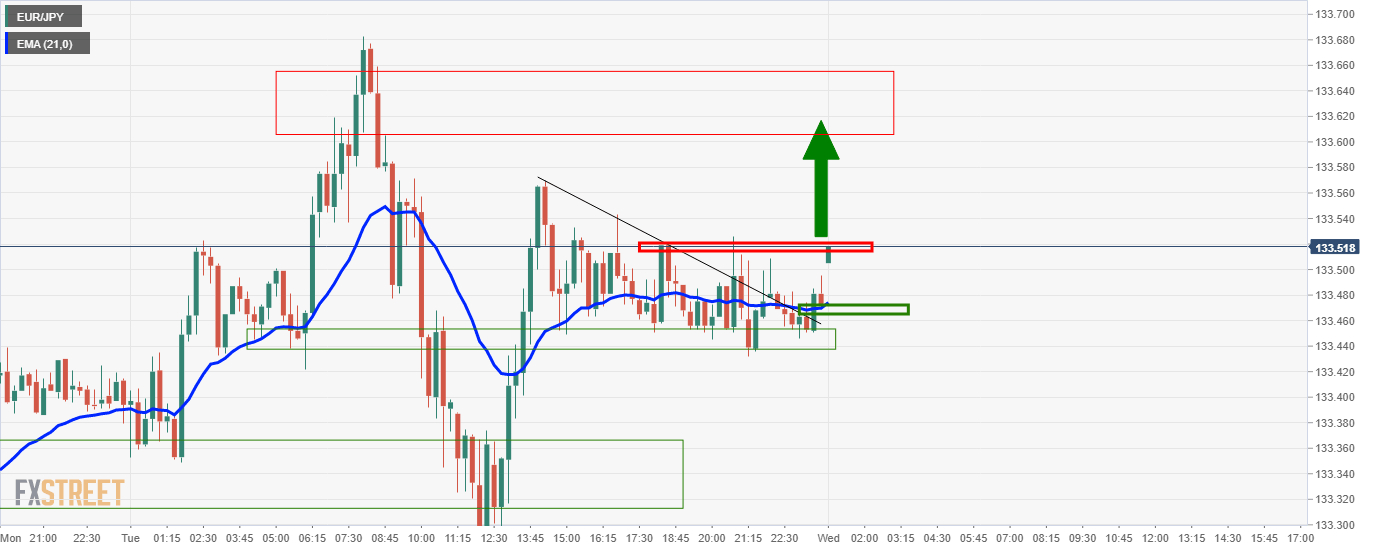 - EUR/JPY bulls taking up the lead in quiet Asian session.