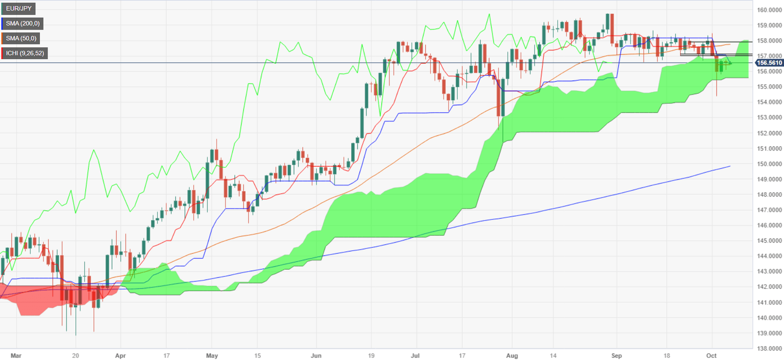 - EUR/JPY stalls at 156.60, encapsulated within the Kumo, with a discernible tilt towards a downward trajectory.